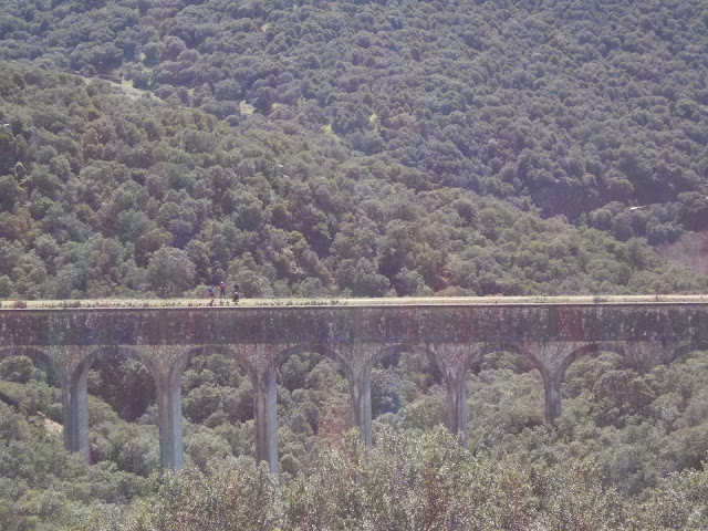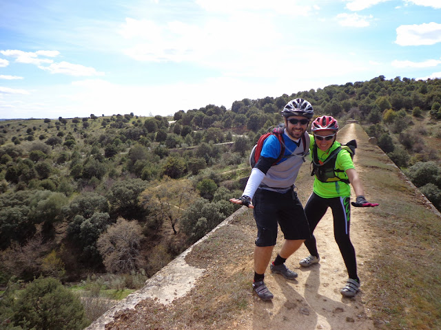 volvimos sobre nuestros pasos para afrontar una fuerte subida que nos llevaría hasta el canal bajo y a los pies del acueducto de la Retuerta que es el más largo (170 m) y alto (28 m), de los acueductos del canal bajo . ¿Subimos y lo cruzamos? ¿Montados o a pie?. Pues lo cruzamos a pie con las bicis a un lado y rezando porque el cemento agrietado de la tubería que había a nuestros pies no nos jugara una mala pasada. Ya en el otro lado del acueducto, pasamos de nuevo las bicis por encima de la valla (con el cartel peligro no pasar riesgo de caída).